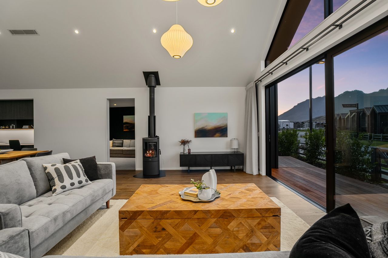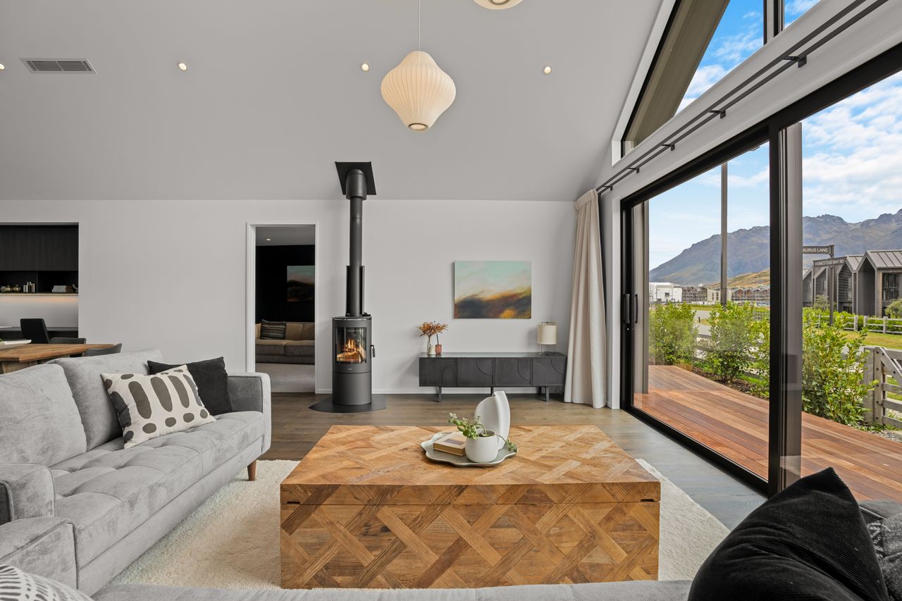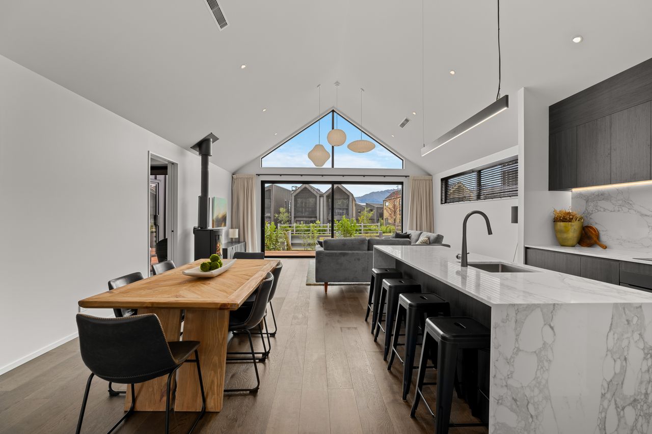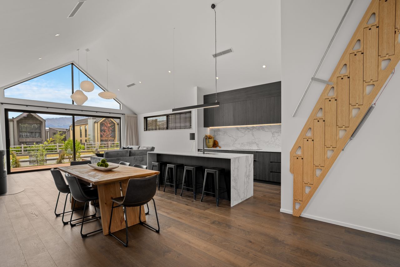 At its core is a light-filled open-plan kitchen, dining, and living zone, elevated by striking raked ceilings and effortless access to multiple decks — perfect for entertaining, relaxed family living, and embracing the Jacks Point lifestyle.