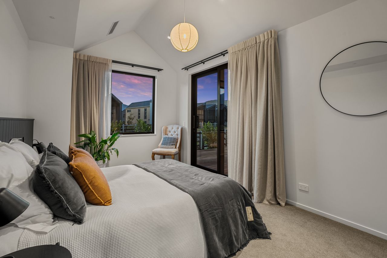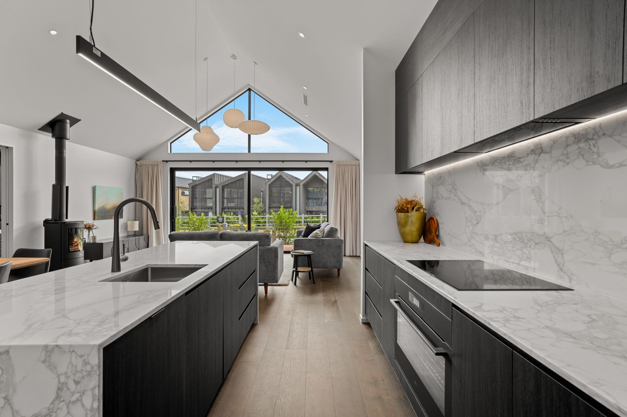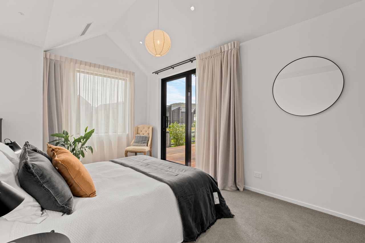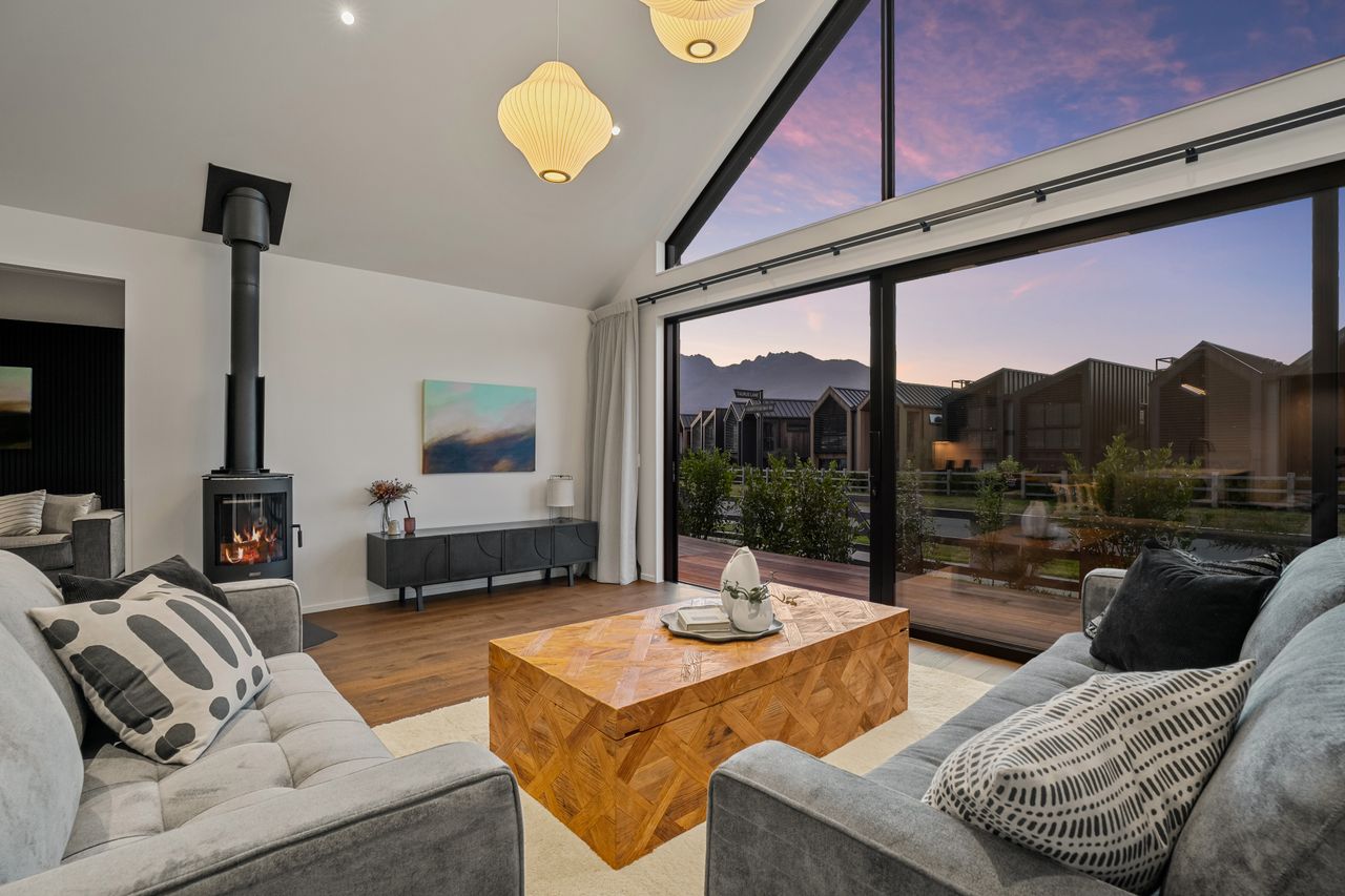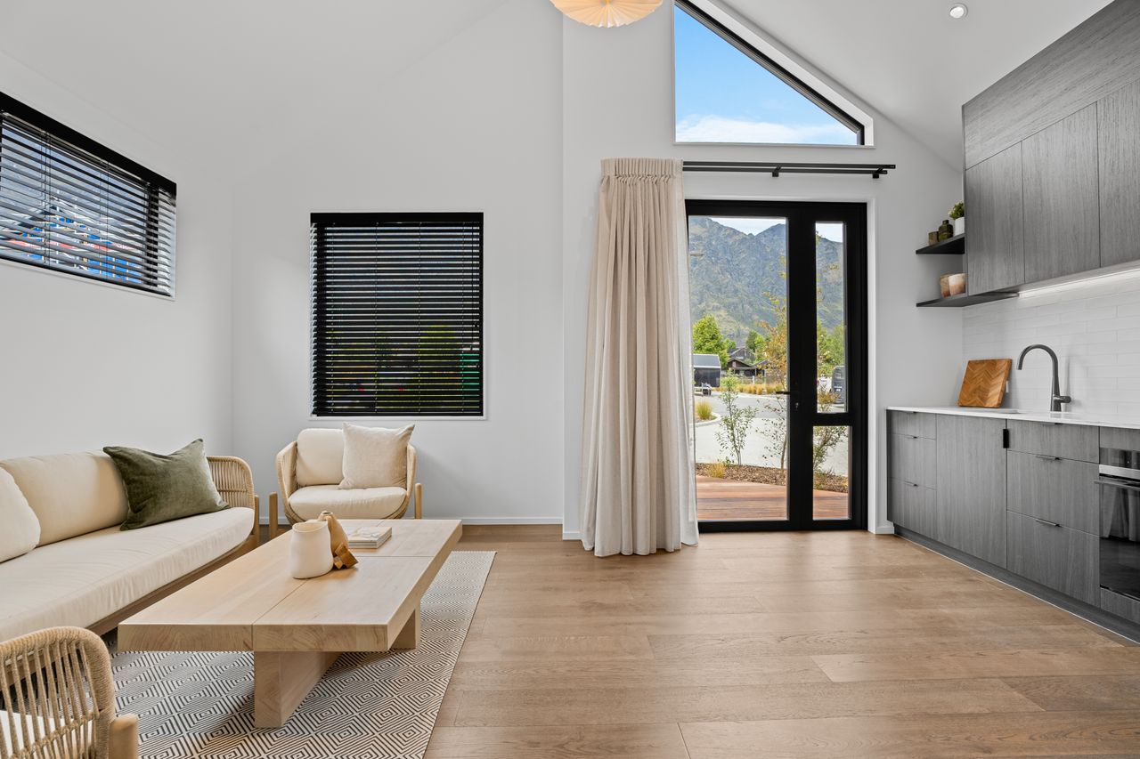 At its core is a light-filled open-plan kitchen, dining, and living zone, elevated by striking raked ceilings and effortless access to multiple decks — perfect for entertaining, relaxed family living, and embracing the Jacks Point lifestyle.