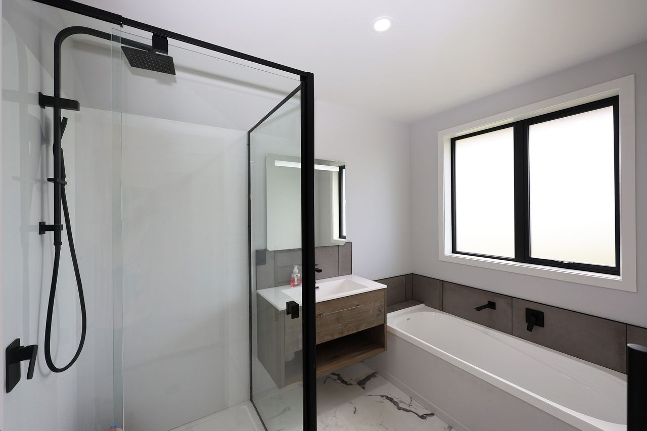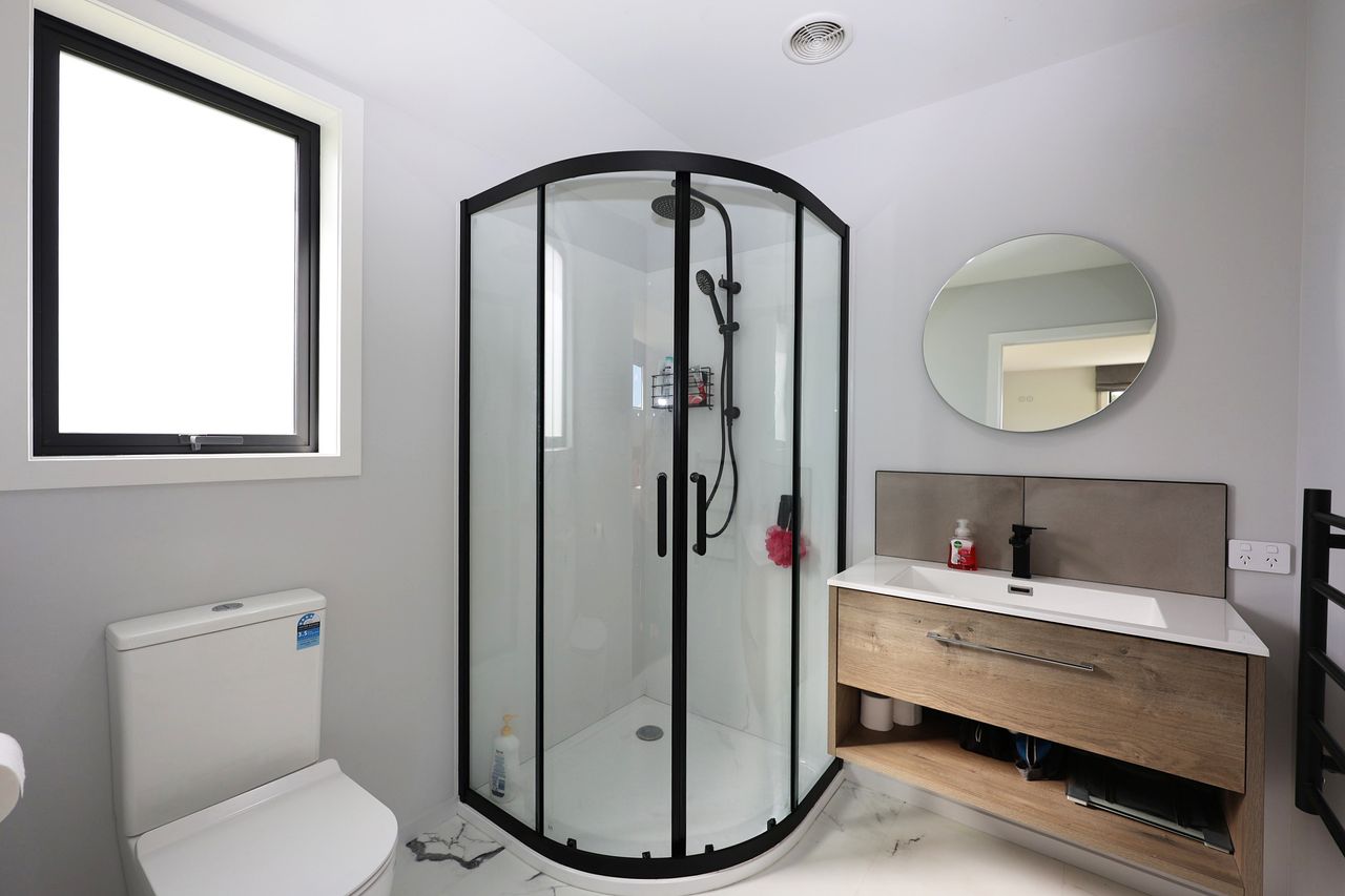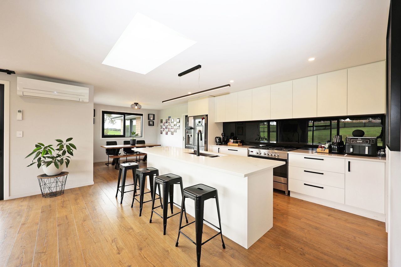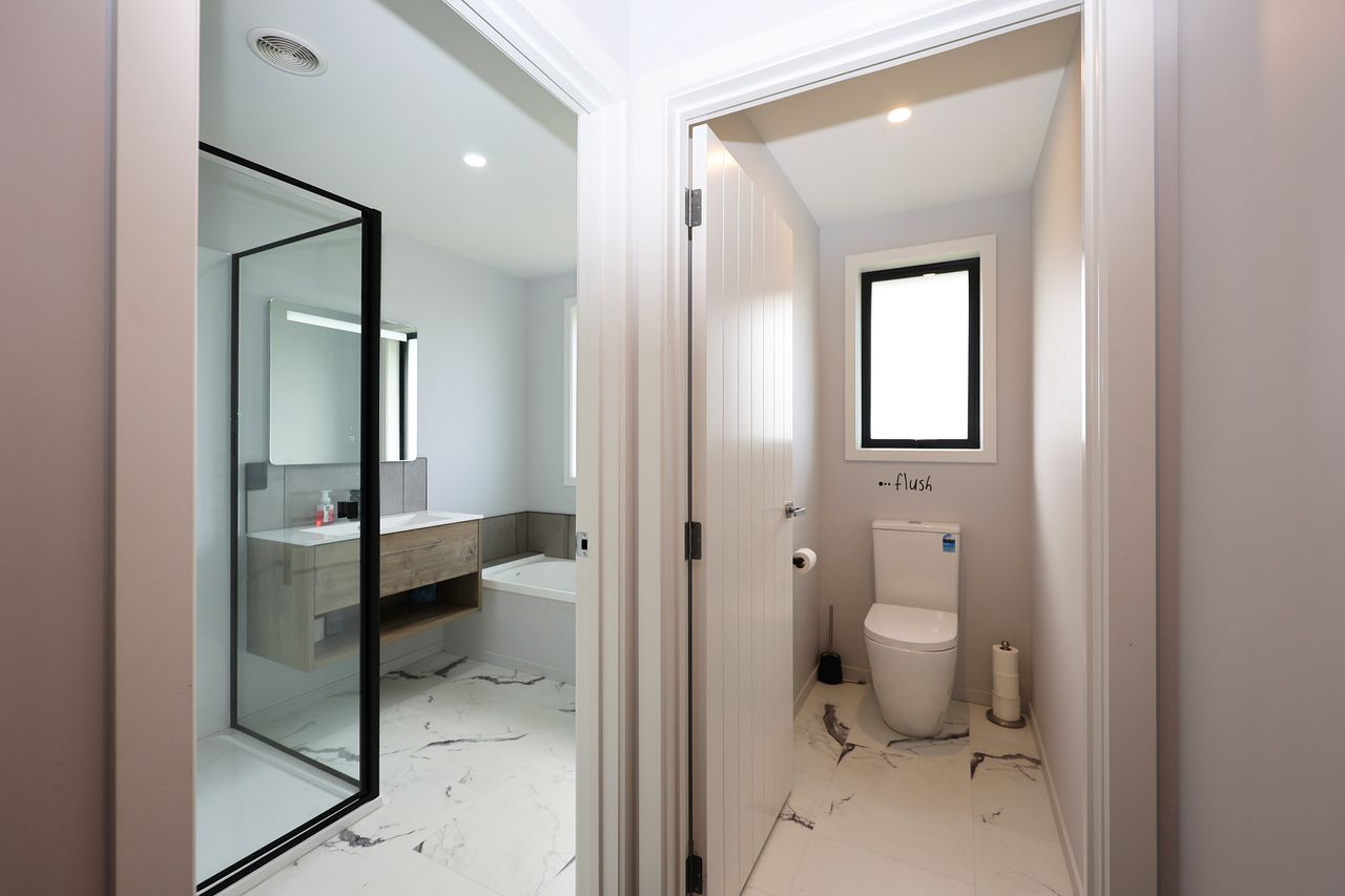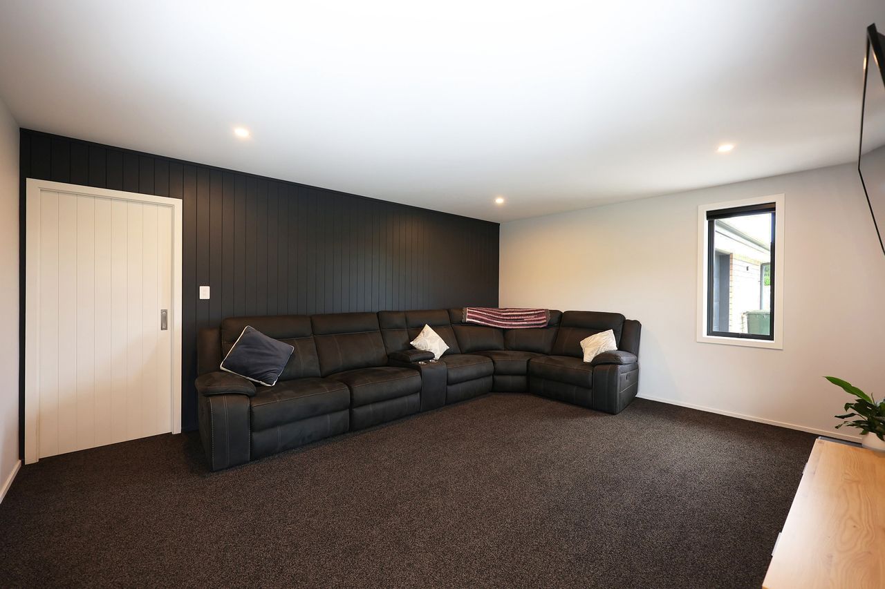 The heart of the home is the expansive north-west facing open-plan kitchen, dining & living area, designed to capture all-day sun & flow effortlessly to a superb outdoor entertaining space. The kitchen is a standout, featuring a 900mm freestanding oven, generous bench & storage space, & the added benefit of a separate scullery. A built-in bluetooth sound system runs throughout the home, adding everyday modern convenience.